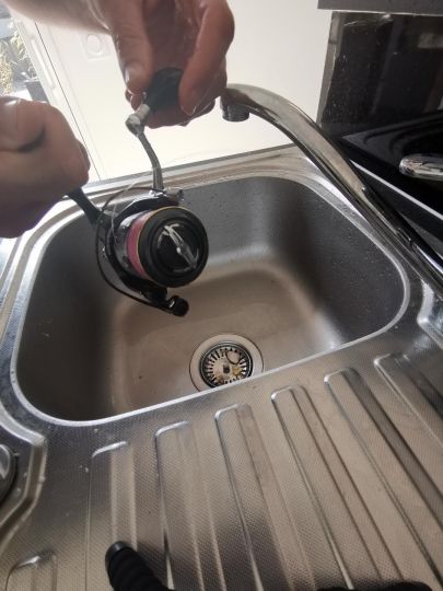 Hot water has the property of dissolving salt (I'll let you look at your saucepan when you're cooking pasta...), so you need to rinse your reel thoroughly under it.