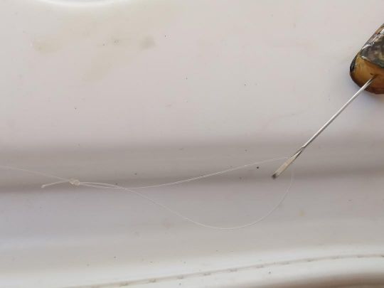- Pass the thread of your leader (or the loop if you use a staple) through the hook of your needle.