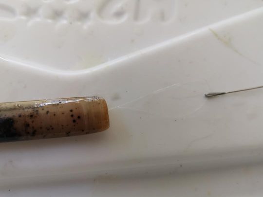 - Slide the knife along the length of your leader to the hook.