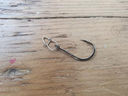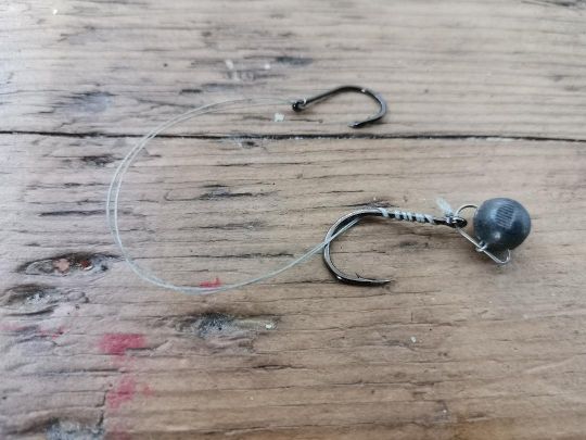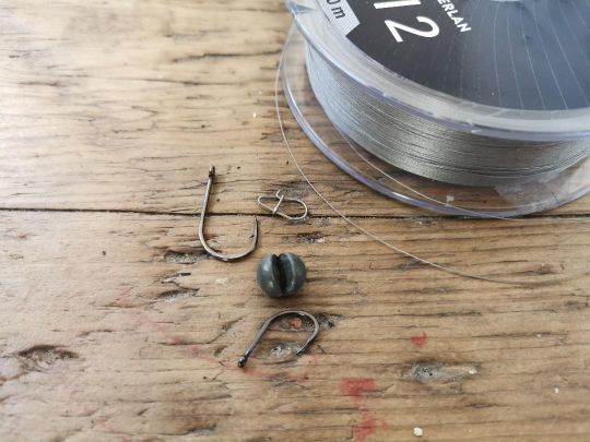 Pinch a piece of buckshot (size to be chosen according to the spots fished) onto the staple, making sure that the most important part is positioned opposite the hook point. By pinching the hook in this way, the center of gravity of your rig will be shifted to one side, giving a perfect presentation and keeping your hook permanently oriented upwards, thus limiting snagging.