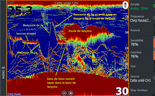 Below this ball, numerous echoes, in the shape of elongated arcs, testify to intense activity. These are yellows coming to feed. The fact that I can see the lure clearly on the screen means that I can place it just below the ball of sand eels, visible to predators, to trigger a successful attack.