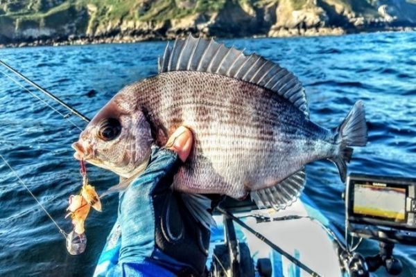 After this first fish brought up very quickly in the kayak, each descent of tenya/gambas will interest the grey sea breams, the old ones (that we call Breton groupers) or the coquettes, very present also at this season.
