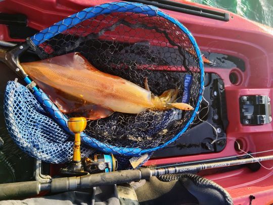 After a quick tour of the banks to see if any fish are active, I head for my squid drift. They don't take long to appear. The first squids are of modest size, but the prettiest soon become active. It's often the floating jig at the top that catches the biggest ones. The rocking is still an hour away, and the tidal current and easterly wind confirm my decision to fit the motor to my float. Drifting upstream is quicker and, above all, easier. I wonder if I'm getting a bit lazy as I get older... In any case, I appreciate the concept. The tide turns and I leave the cephalopods for a while. I switch to the trolling version.