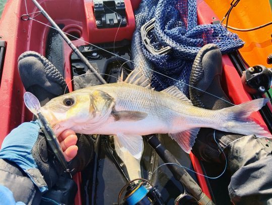 I walk along the edges with one of my favorite lures, a 3 DB Jerkbait, rigged with single Owner hooks. I fish in 3 to 4 meters of water and end up finding a few fish. Arriving in front of the park area, where the water is between 6 and 8 meters, I change lure and take out a large bib lure found on the bank during the last spring tides. It doesn't fail, a nice round fish grabs it and gives me a nice fight.