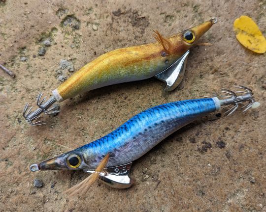 Turlut: phosphorescent (e.g. Yamashita Egi-Q Glow). Light attracts cuttlefish