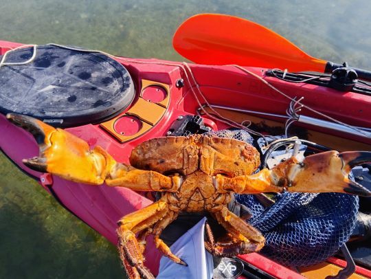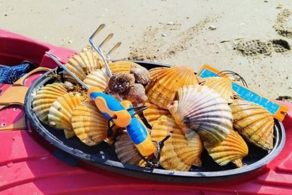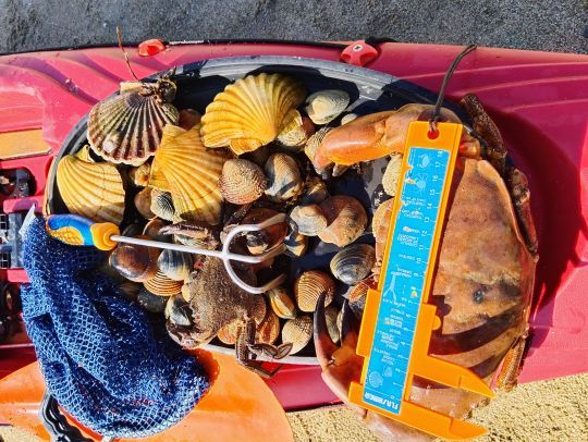 I decide to finish the last hour of wandering by exploring the various pools between the pebbles, dragging my kayak behind me. I come across a spot with big sleepers. I pick up a big male and leave 3 big females in the water. The mesh is 15 cm, and my ruler, which stops at 20 cm, is too small for the measurement... I also unearth a few scallops, but I don't have time to refuel as the tide is coming in. I'll be back tomorrow to look for them specifically, so it's time for a snack before the return trip.