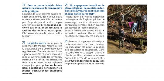 The brochure is well done, with beautiful photos and simple words that simply explain the link between our hobby and nature, the role of anglers in protecting the environment, the economic weight, the strength of a network and its volunteers...