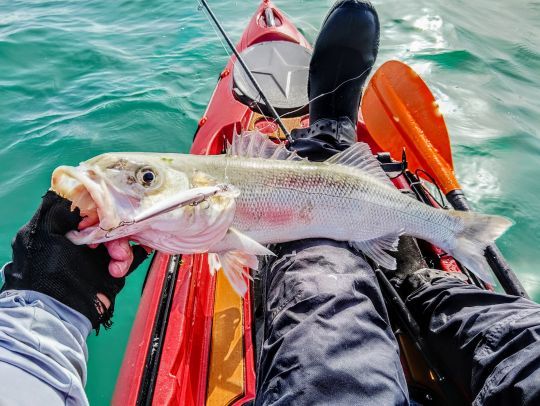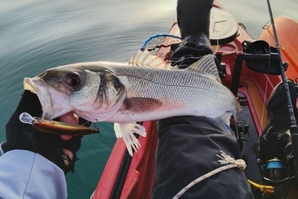 On the way back to my starting point, the last two will be measured at 51 and 52 cm, which is better. It's 11:00 a.m. and I've reached a deeper zone in what's known as the seaweed field. This is an area where seaweed is grown for cosmetics, and where there are cages for fattening farmed abalone. The wind is still quite strong and the sea is a bit rough. I decide to make my way between two rows of buoys, knowing that there are about ten meters below the kayak. For this zone, I switched to a lure working in the 4-meter depth range. A Deep Diver 90 in pearly white, again from Flashmer. I try to keep my nose in front of the waves as I work my way up the buoy lines, and then it's the cartridge in my arm, this one's prettier. It gives me a nice fight. I have to work the fish, while keeping my line of navigation. You have to avoid getting in the way, while avoiding getting too close to the buoy lines. Thanks to the steppe and the rudder control which responds well. I put it in the net on the first try. The fish measures 62 cm, which is much better.